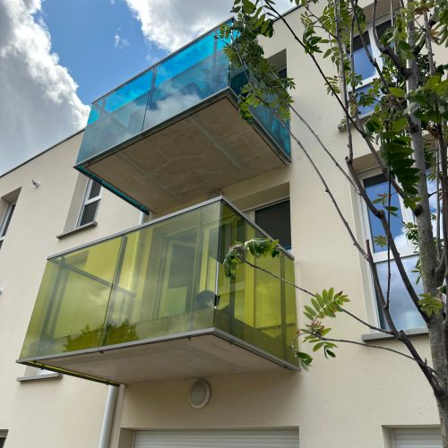 - Des balcons en verre translucide colorés viennent ponctuer les façades du collectif.